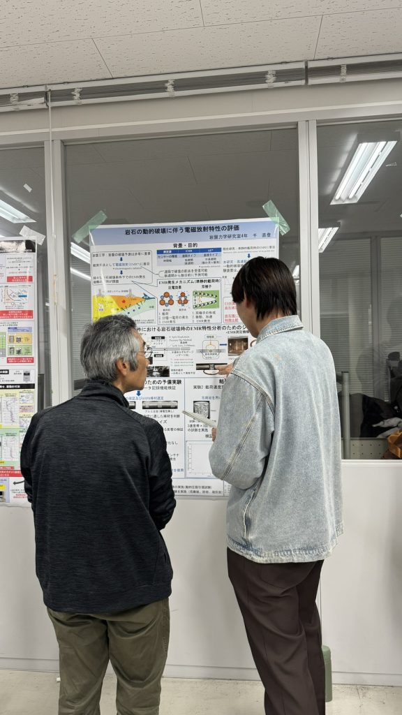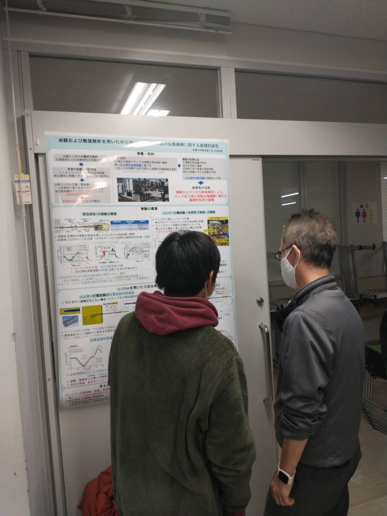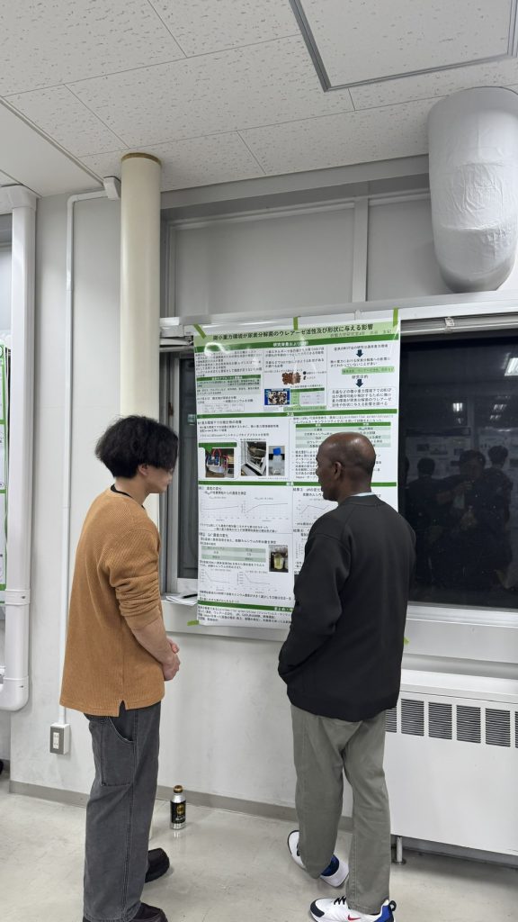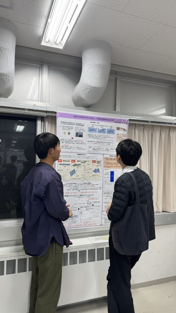 11月14日に、当研究室のB4の学生が資源循環システムコースの卒論中間発表会でポスター発表を行いました。B4にとっては初めてのポスター発表で,他研究室の先生方から貴重な意見をいただくことができました。